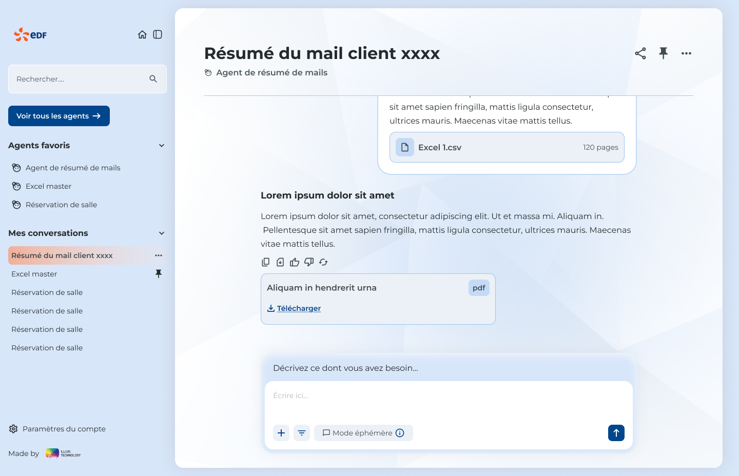 Nous avons ensuite travaillé sur les principaux parcours : l’arrivée sur l’agent par défaut, la consultation du catalogue d’agents, la page de conversation, la gestion de l’historique ou encore l’upload de documents.
